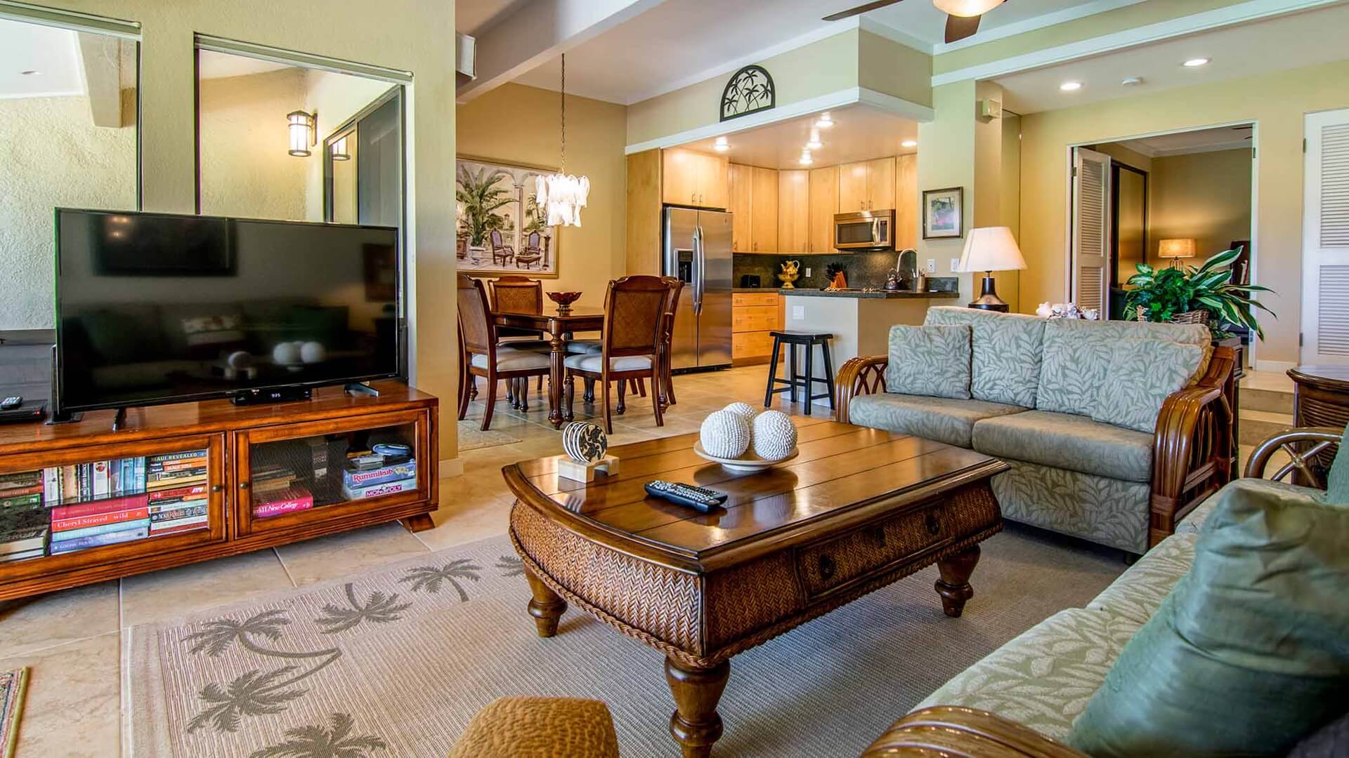 Kapalua Golf Villa 14P12 is a two-bedroom vacation rental with a floor plan of approximately 1,800 square feet. The “P” in this unit’s name means it is a garden-level rental, and guests enjoy the lovely golf course views from both inside and outside. The entire unit has been newly renovated, so if modernity is on your checklist when looking for accommodations, you can tick that box.