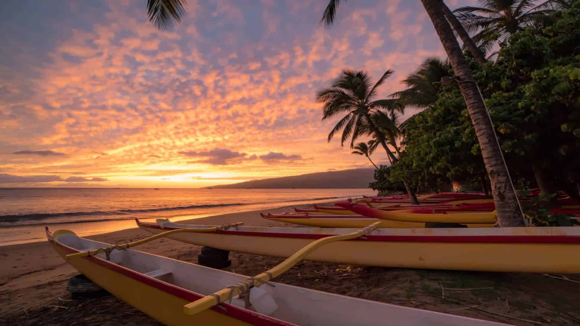 An outrigger canoe at Hanakaoo Beach, also known as Canoe Beach, at sunset