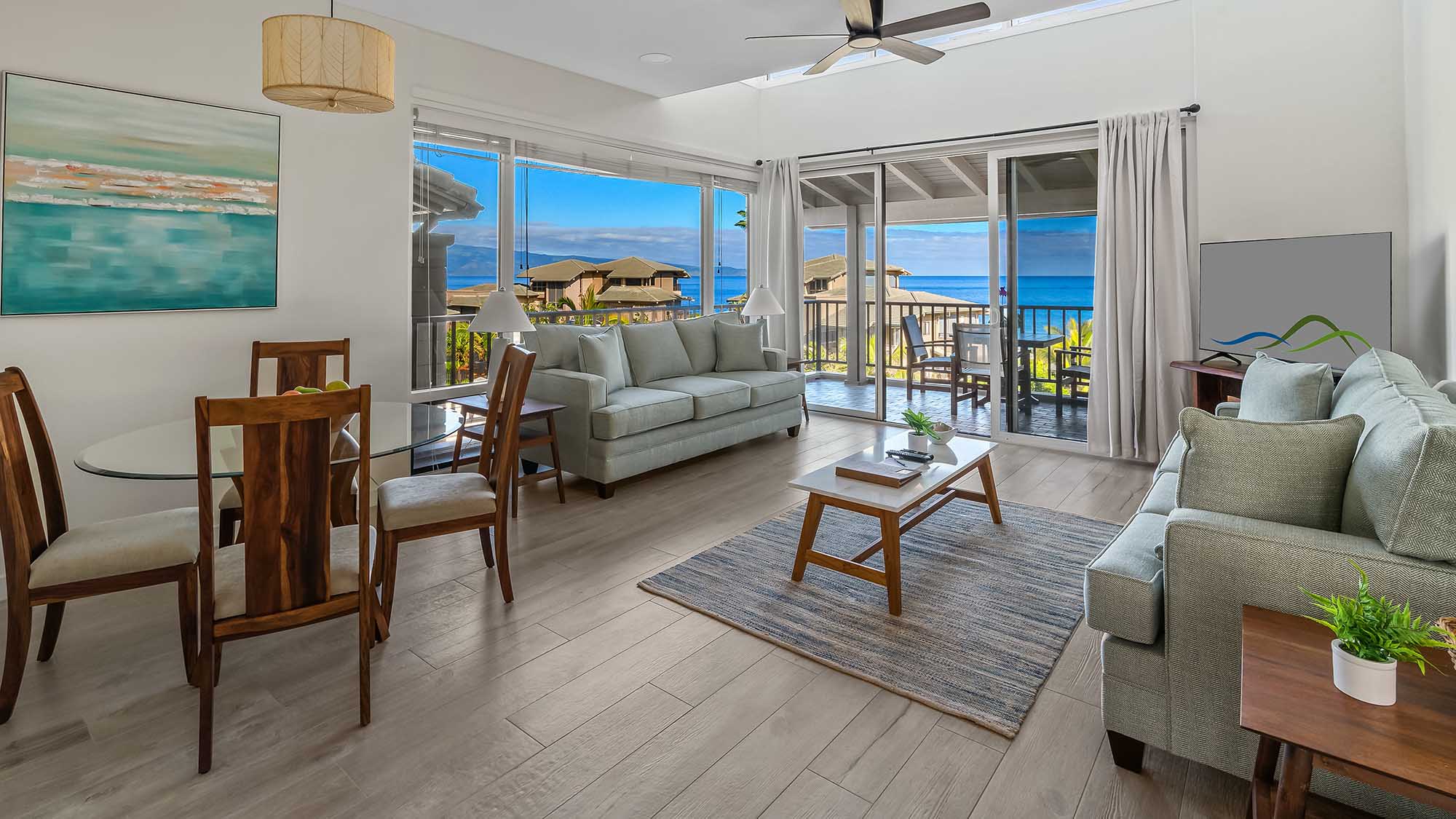 The living room includes comfortable seating and a flat-screen television. There is a queen-sized sleeper sofa that offers more sleeping space. The living room also offers access to the covered ocean-view lanai. The lanai is complete with dining seating. Whether you want to unwind in the fresh air or enjoy a tasty meal with a view, there is no doubt you will spend plenty of time out on the lanai.