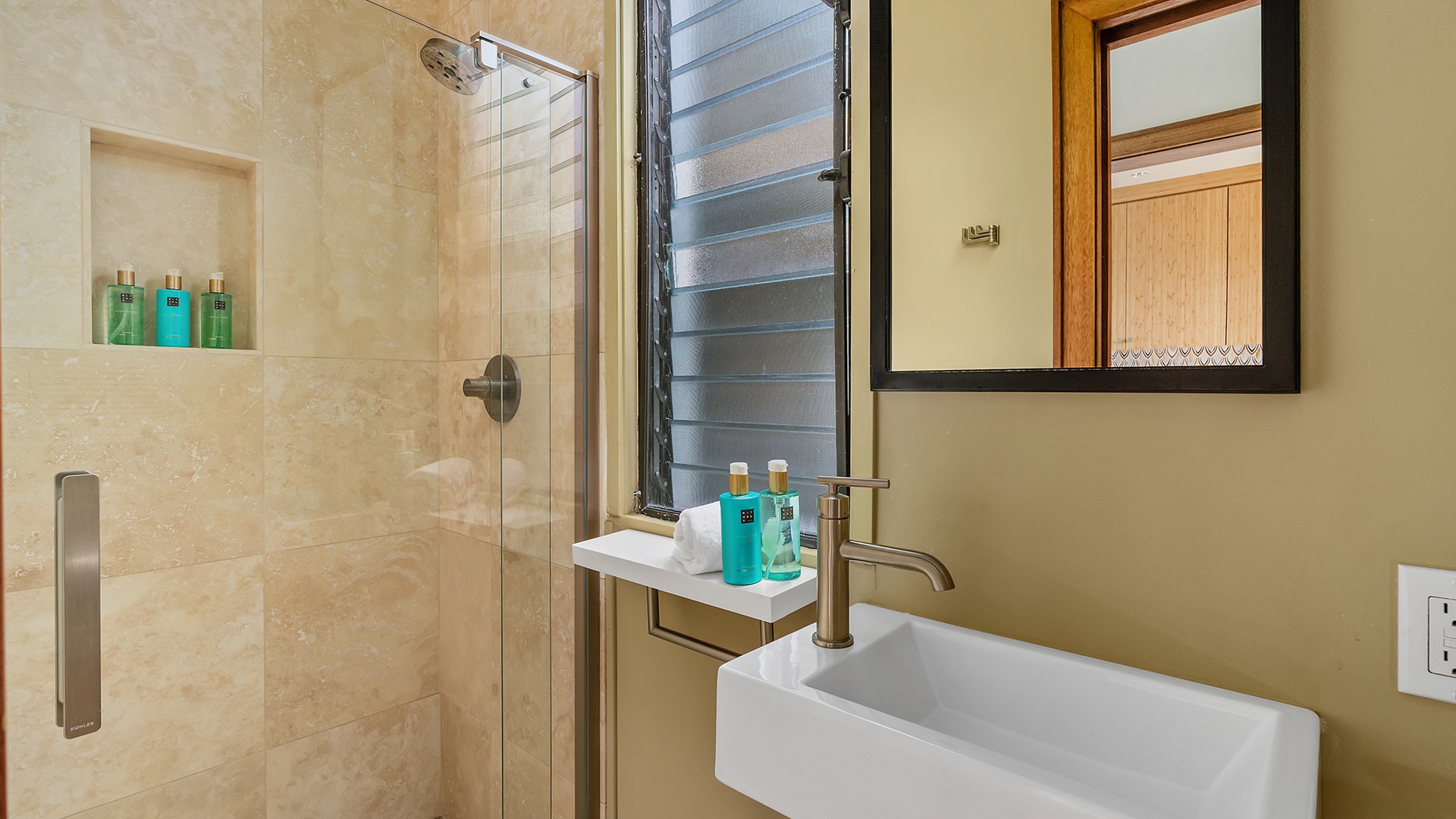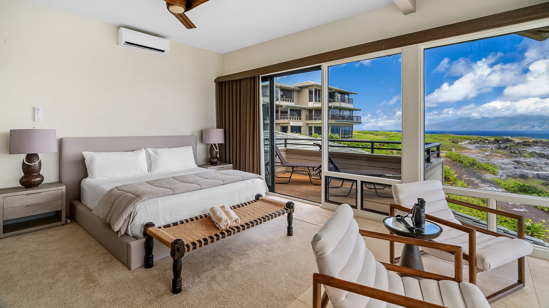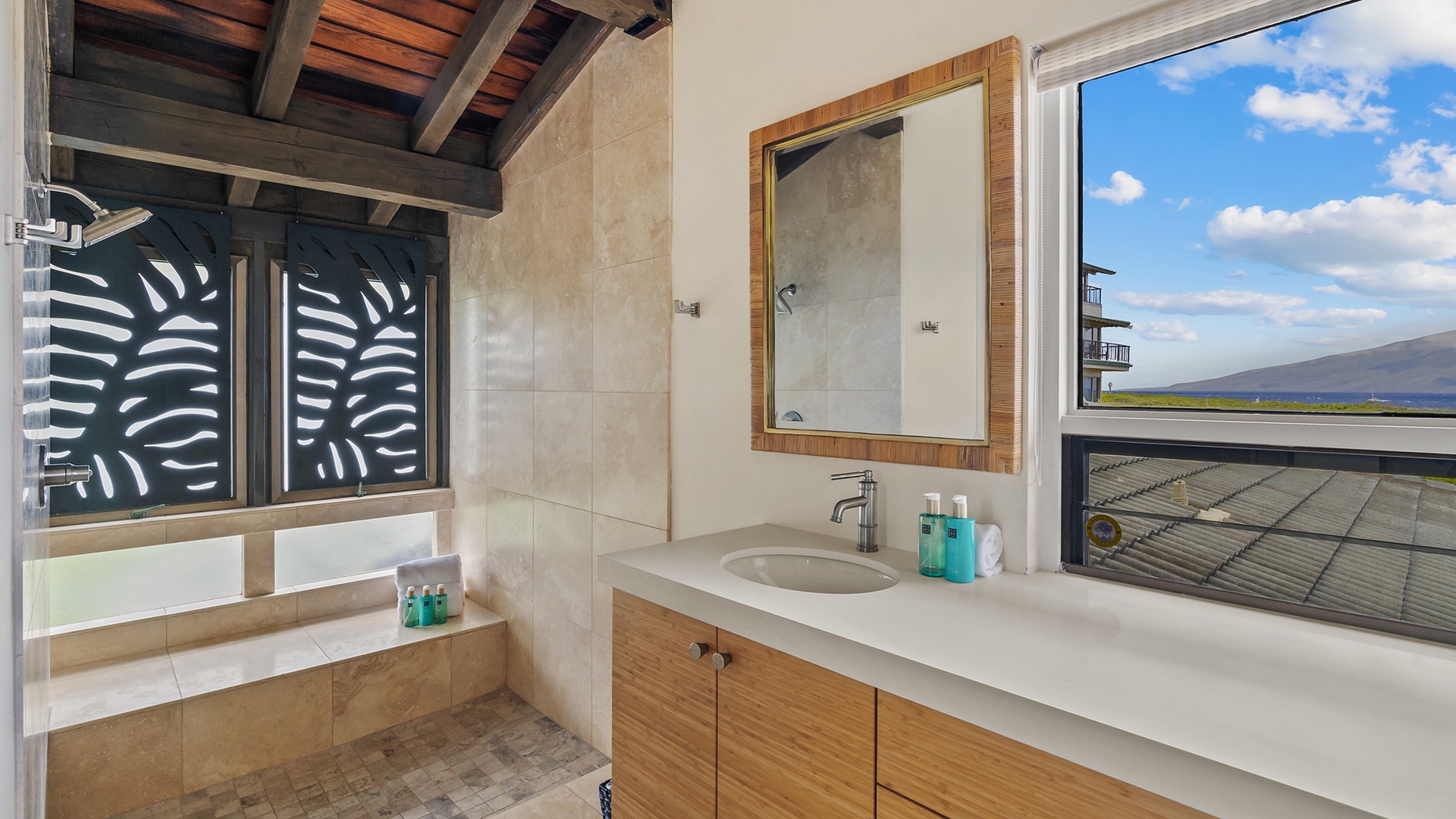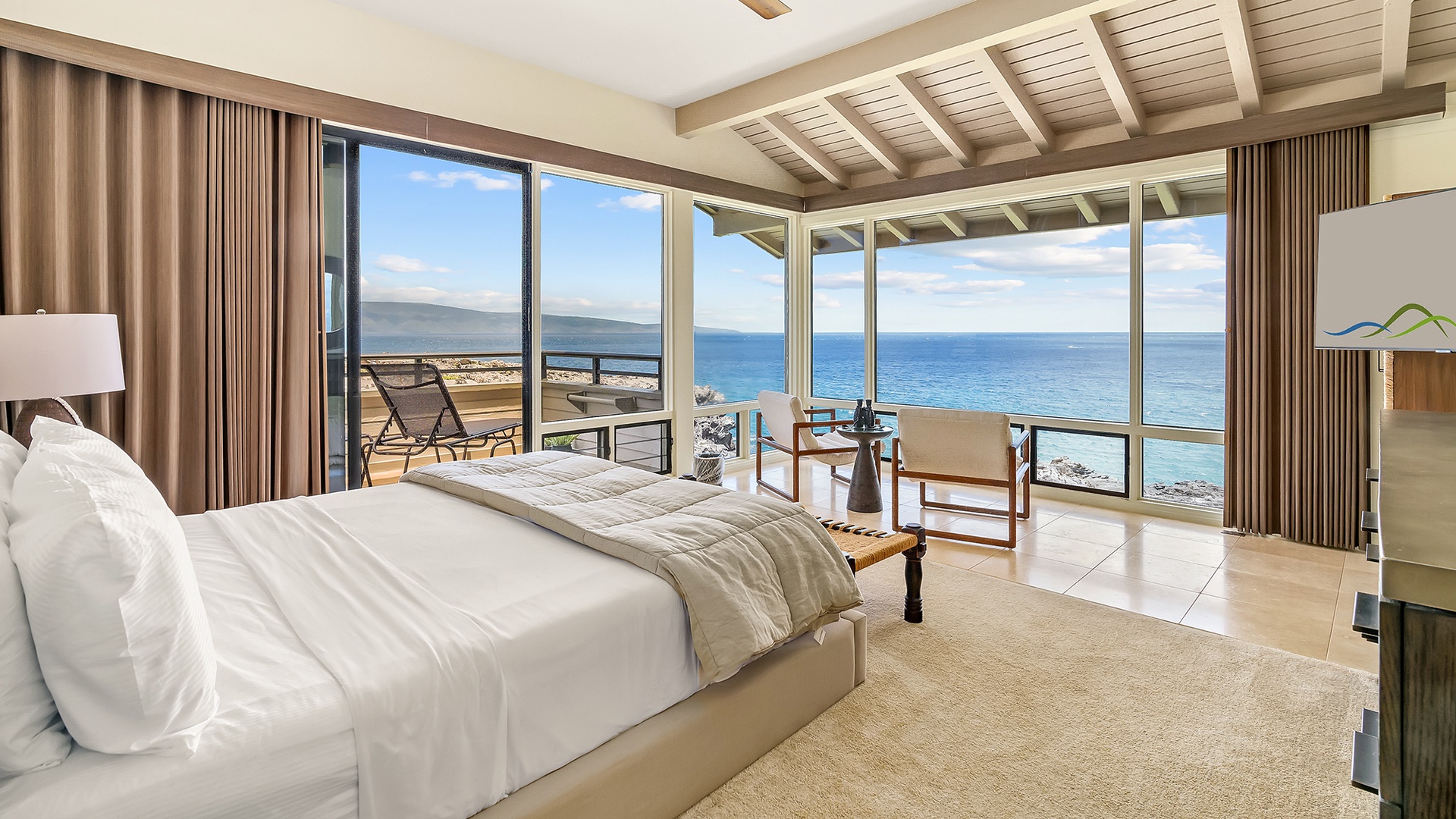 • Master Bedroom Suite – ocean view, upper level, AC, king bed, TV, ocean view seating area, access to private ocean view lounging lanai, full bath with walk-in shower