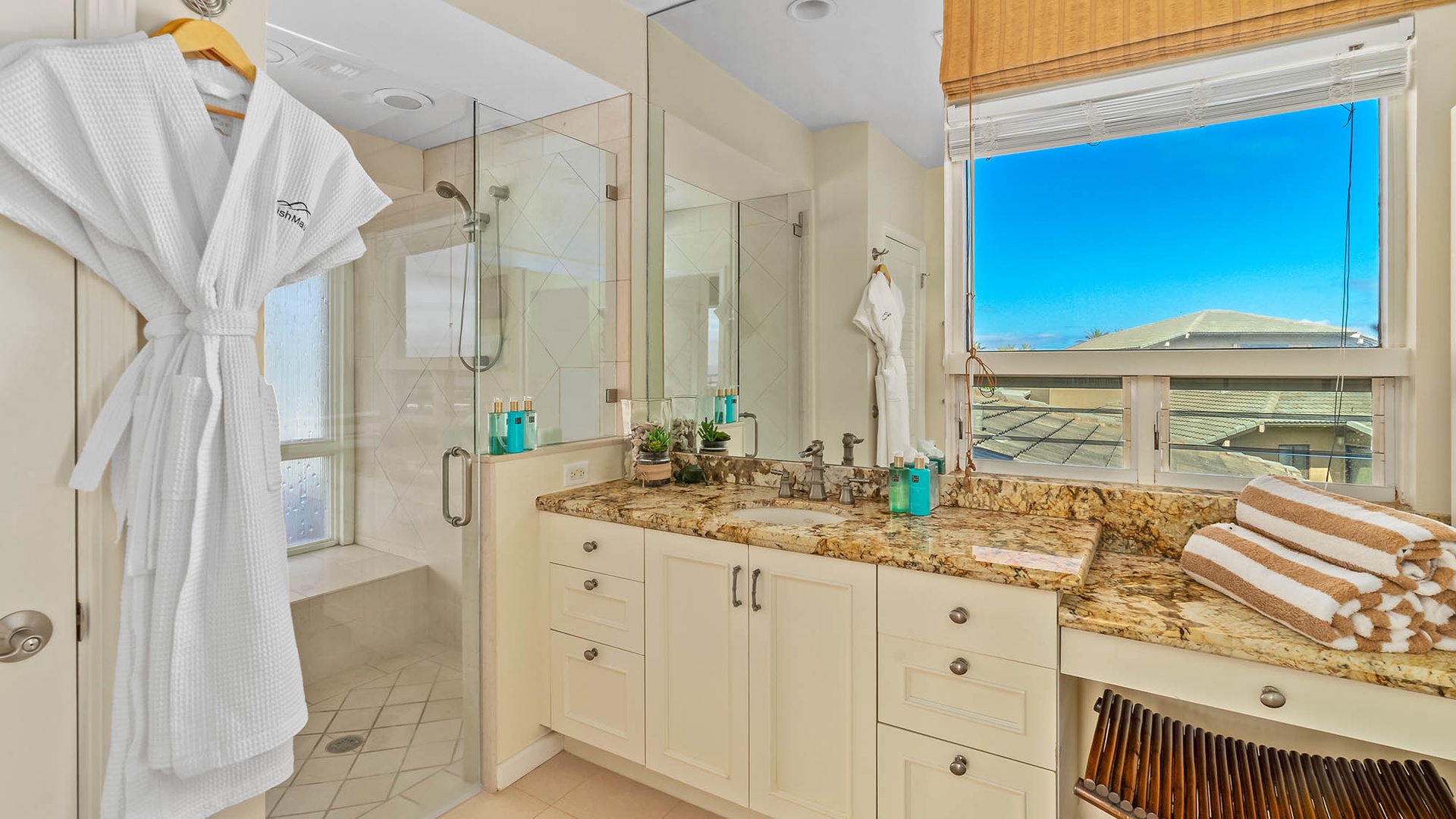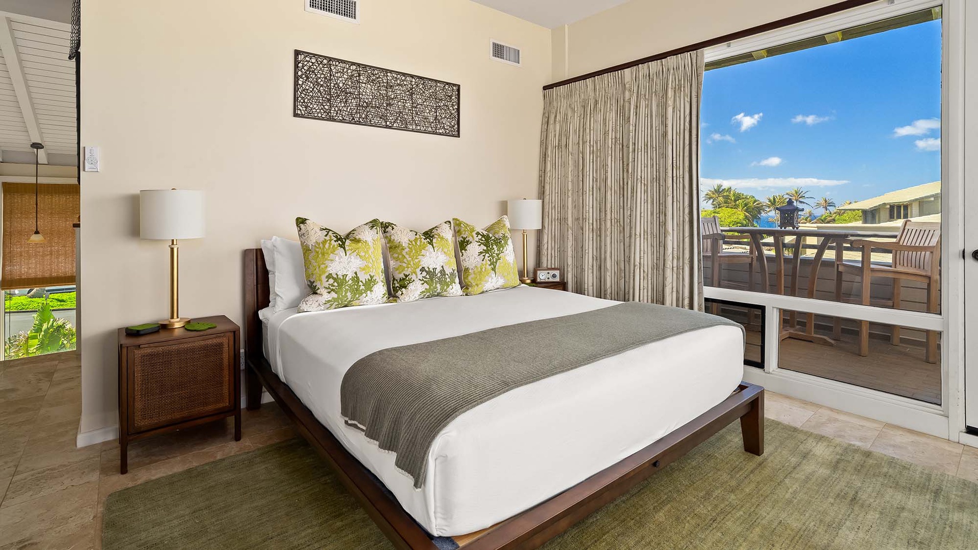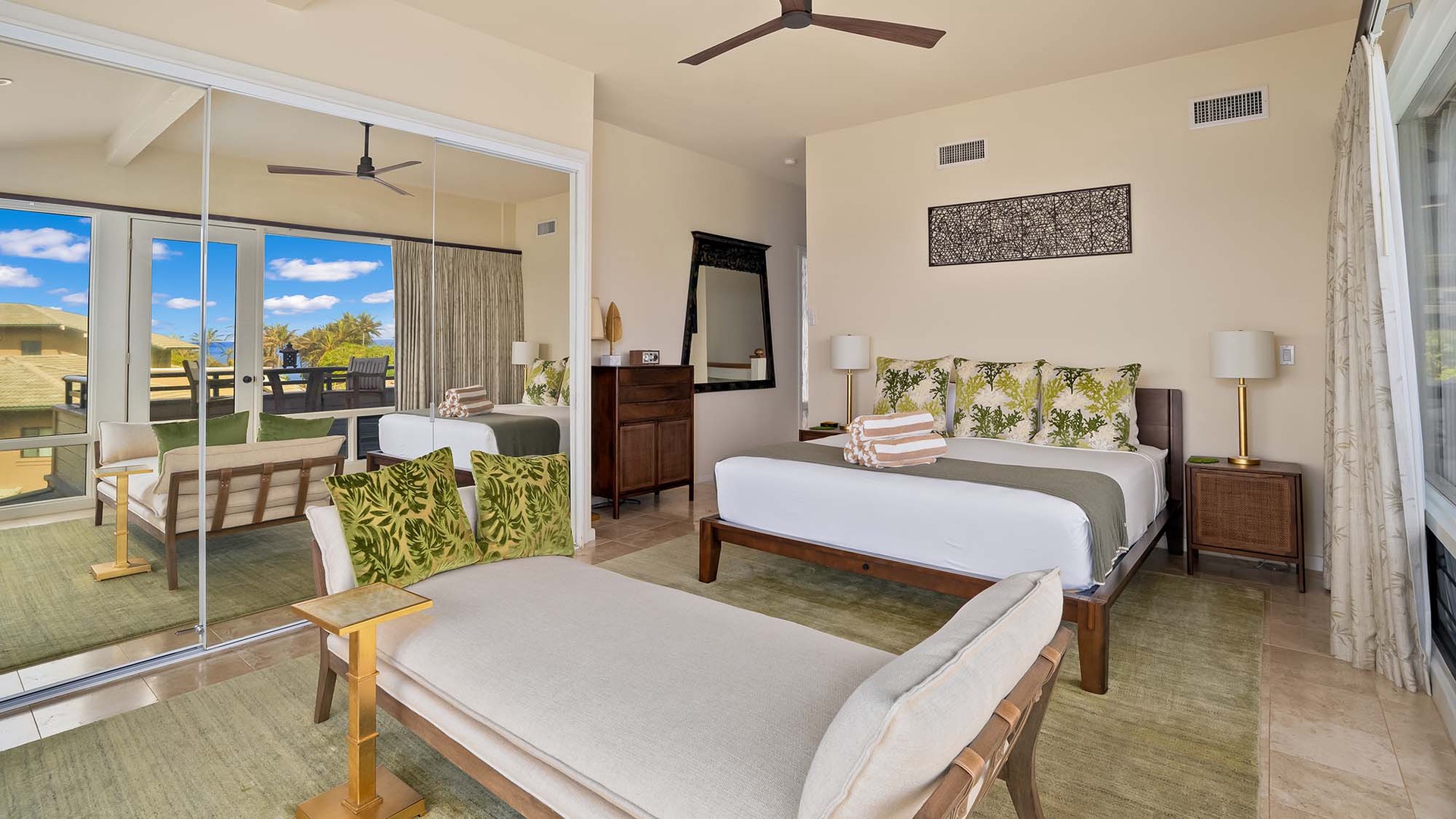 • Master Bedroom Suite – Upper level, AC, king bed (see below), access to private lanai with sunset views all year, full bath with walk-in shower