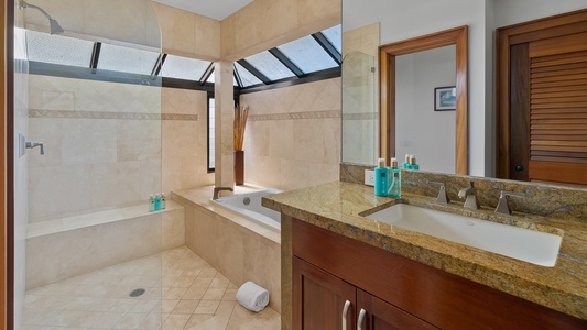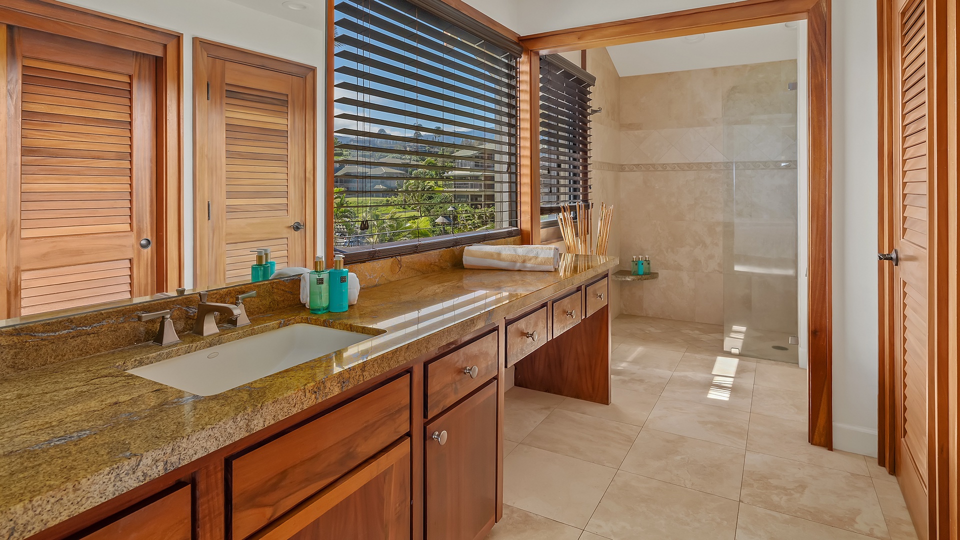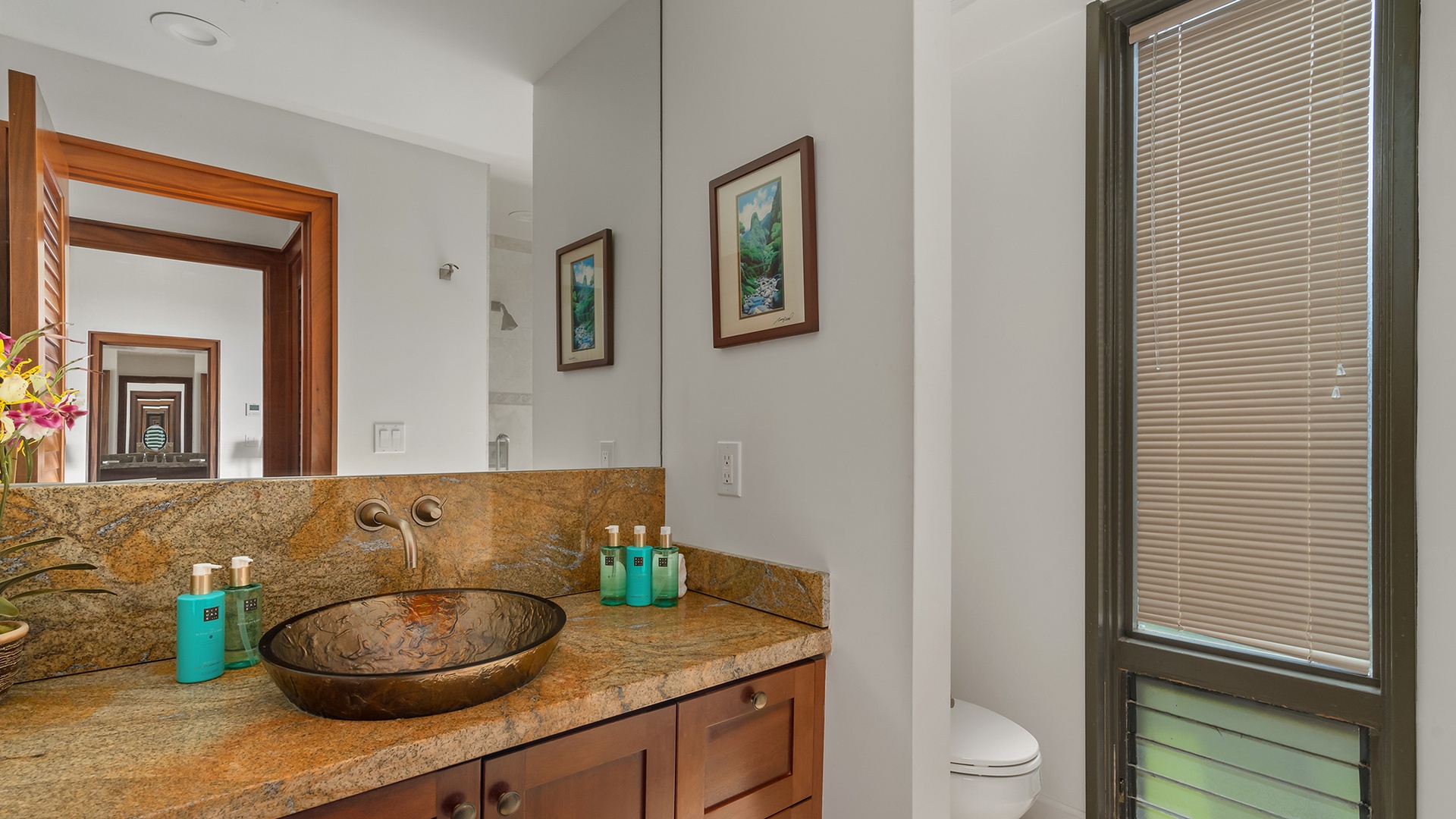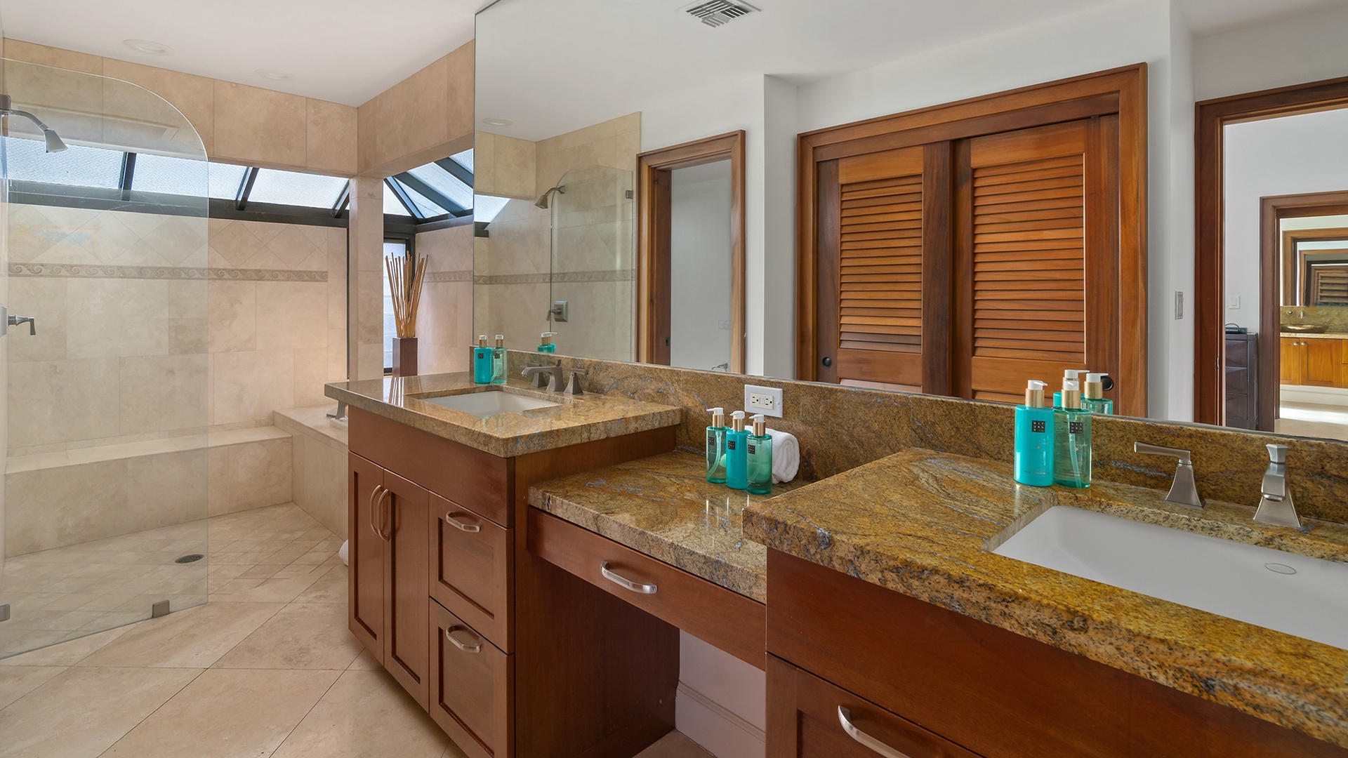 Two bedrooms, both with attached full bathrooms. One of the master bedrooms is loft style and overlooks the living room. Also additional bathroom with shower which we used to rinse off after snorkeling at Kapalua.