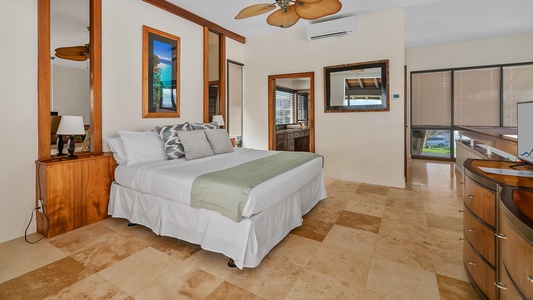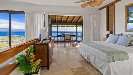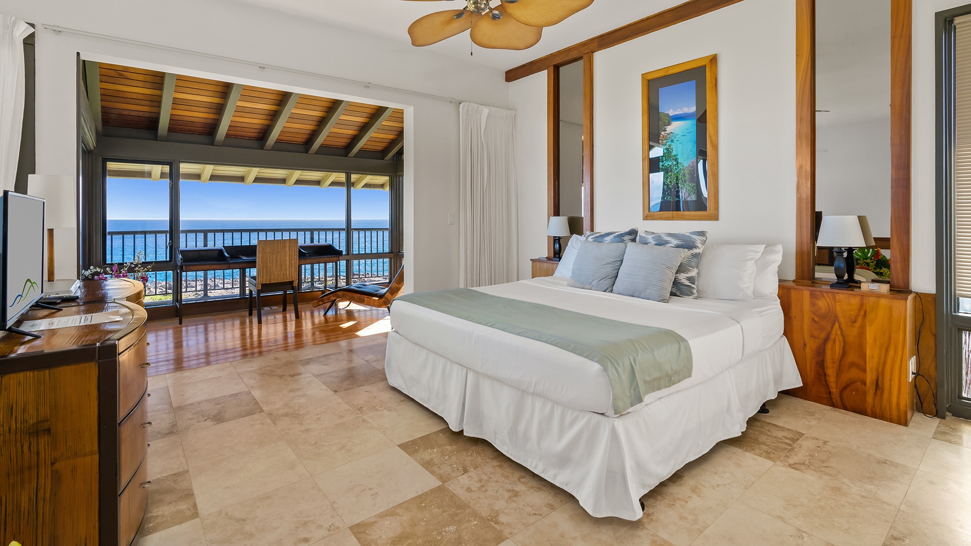 • Master Bedroom Suite Loft – ocean view, upper level, AC via spiral staircase, king bed, flat screen TV, desk and seating area with ocean view, full bath with walk-in shower