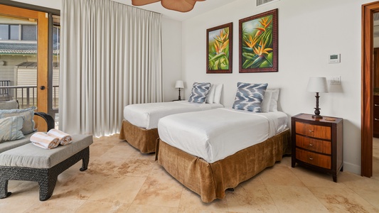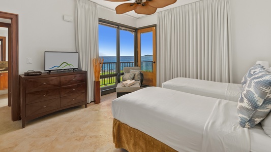 • Second Bedroom Suite – lower level, AC, two twin beds (convert to king upon request), access to private ocean view seating full bath, tub and walk-in shower