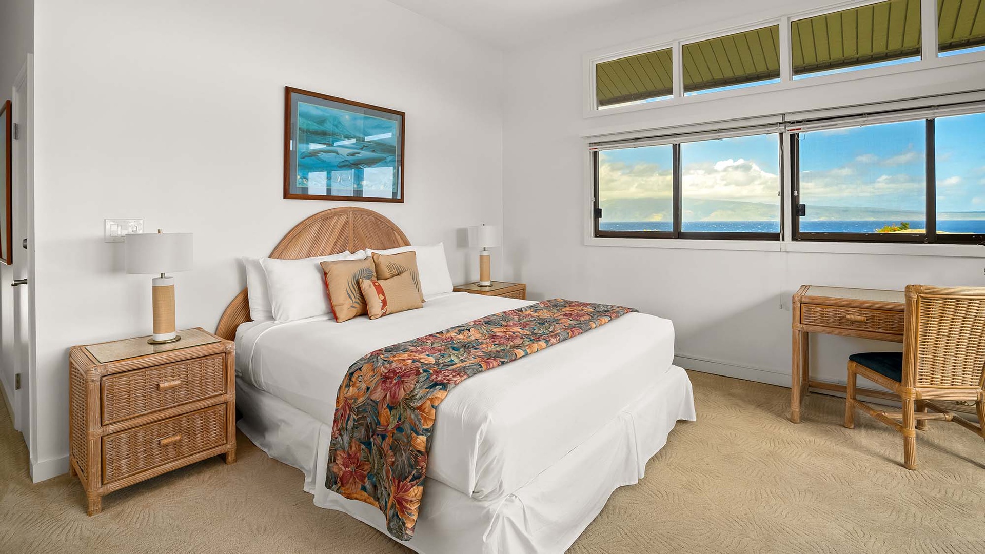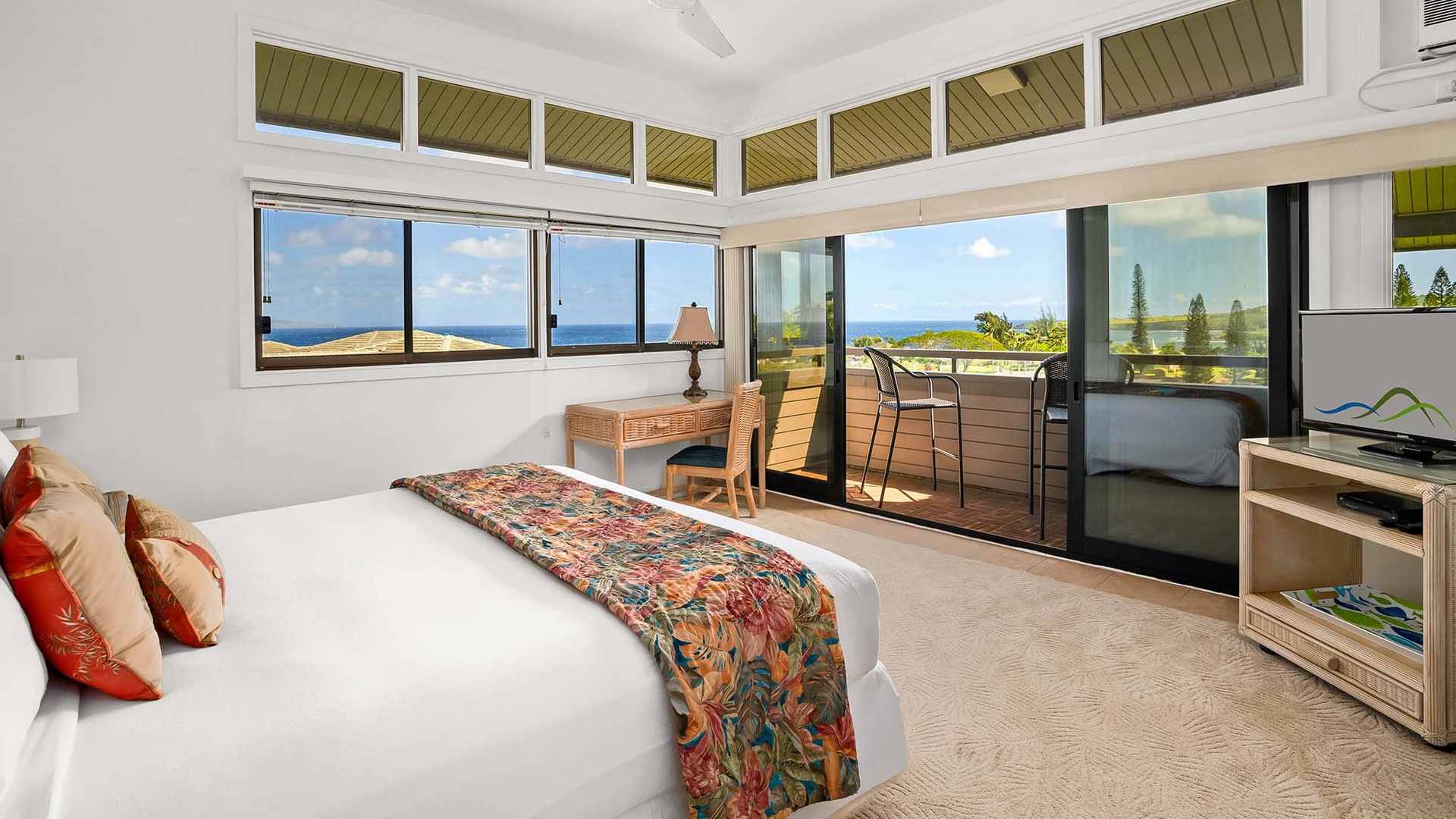• Master Bedroom Suite – ocean view, upper level, AC, king bed, flat screen TV, access to private ocean view seating lanai, full bath, tub with shower